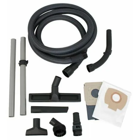dans un carton avec tuyau d’aspirationde 3,5 m (Ø 32 mm), 2 tubes d’aspiration (aluminium), tube de poignée avec curseur d’air secondaire, suceur pour sol, suceur plat, suceur universel, brosse ronde, adapteur d’outil avec réglage de la puissance d’aspiration, filtre non tissé sac, sac poubelle
